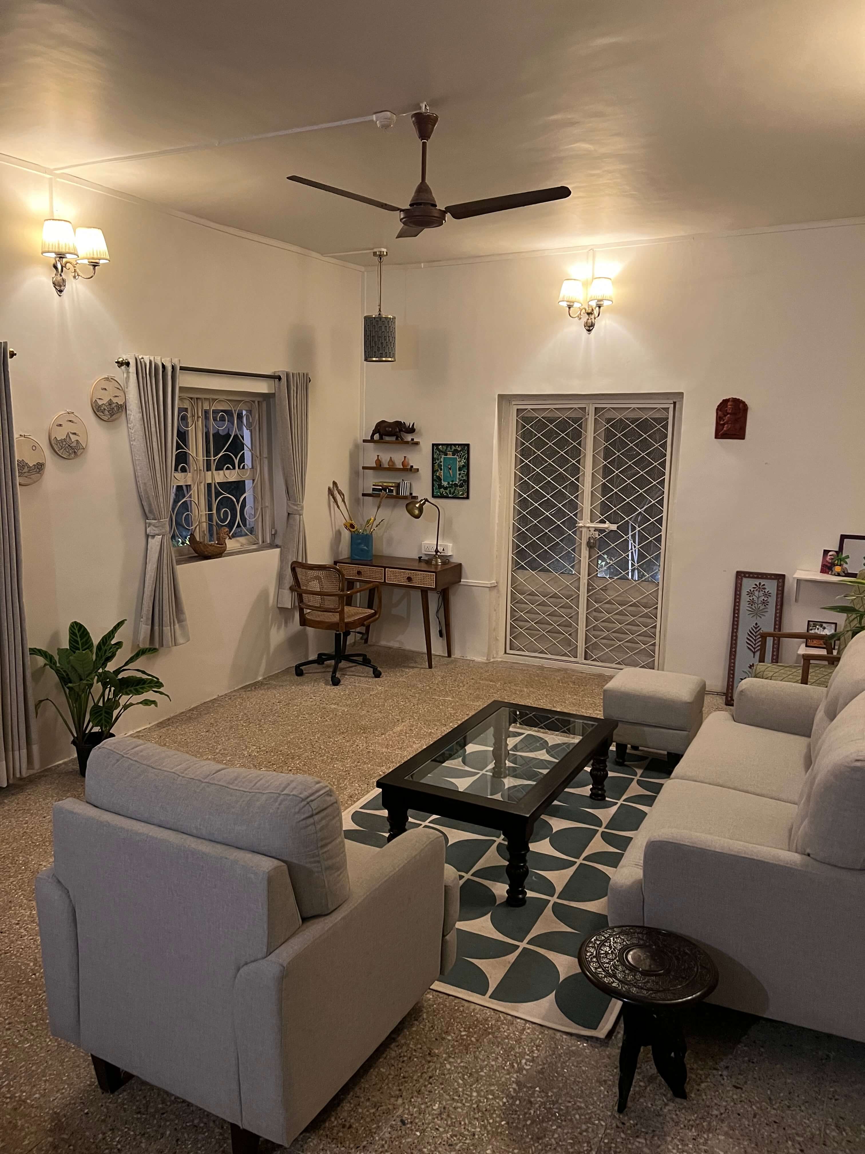 A spacious and elegant stay with two master bedrooms (one on the ground floor and one on the first floor), both with attached washrooms and an extra rolling bed. The first floor opens up to a private terrace with outdoor seating, offering stunning green views on all sides.
